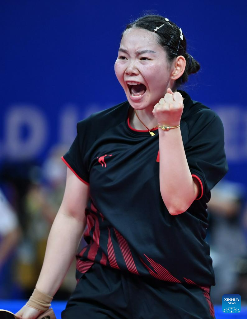 He Zhuojia of China reacts while competing against Kimura Kasumi of Japan during the Table Tennis Women's Team Final between team China and team Japan at the 31st FISU Summer World University Games in Chengdu, southwest China's Sichuan Province, Aug. 1, 2023. (Xinhua/Zhao Zishuo)