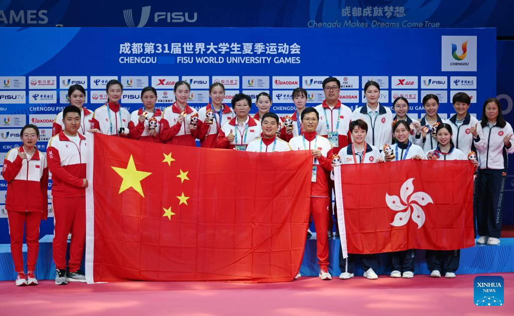 Members of team China and team China's Hong Kong pose for photos during the awarding ceremony of the Table Tennis Women's Team match at the 31st FISU Summer World University Games in Chengdu, southwest China's Sichuan Province, Aug. 1, 2023. (Xinhua/Zhao Zishuo)