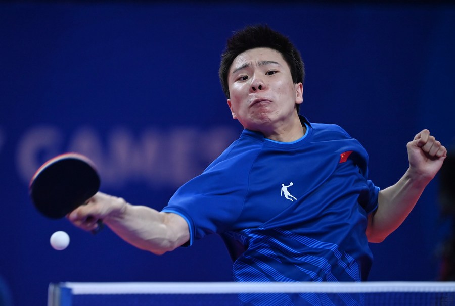 Xu Yingbin of China hits a return during the table tennis men's team final against Chinese Taipei at the Chengdu Universiade, August 1, 2023. (Xinhua/Zhao Zishuo)