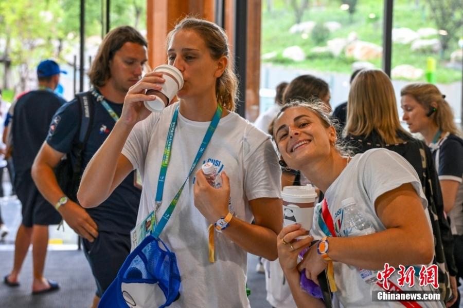 International athletes enjoy "panda" coffee at the Chengdu Research Base of Giant Panda Breeding in southwest China's Sichuan Province, Aug. 1, 2023. (Photo: China News Service/Zhao Wenyu)
