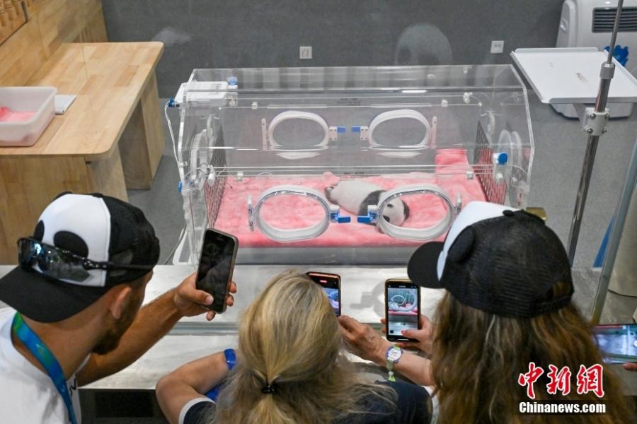 International athletes take photos of giant panda cubs at the Chengdu Research Base of Giant Panda Breeding in southwest China's Sichuan Province, Aug. 1, 2023. (Photo: China News Service/Zhao Wenyu)