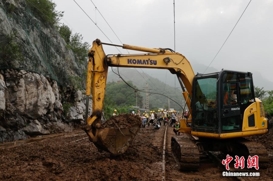 An excavator clears railway tracks on Fengtai-Shacheng railway in Mentougou district of Beijing, Aug. 1, 2023. (Photo: China News Service/Jia Tianyong)