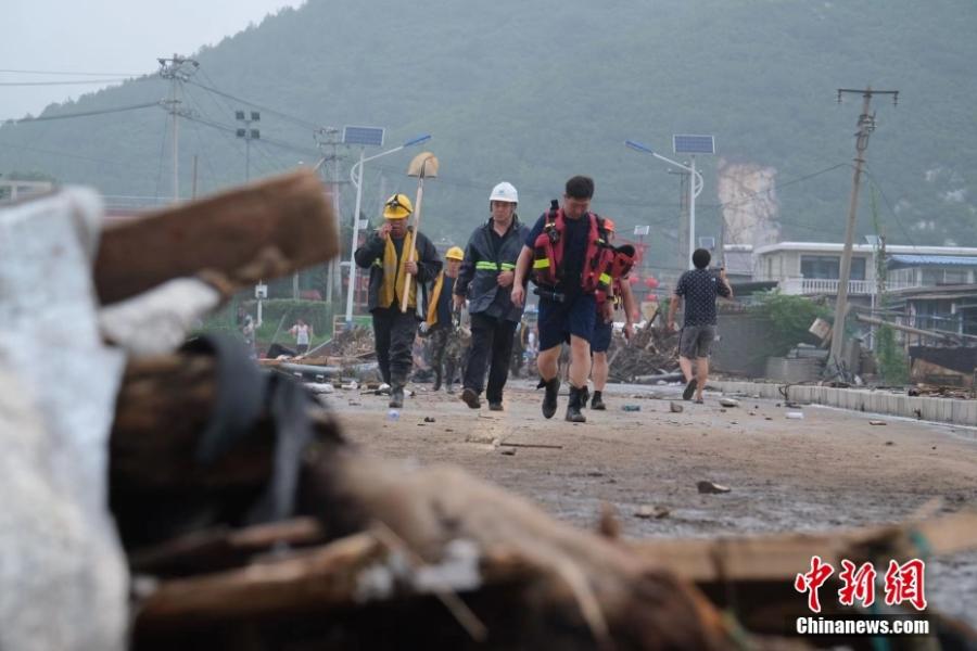 Rescue workers clean up a street in flood-hit Mentougou district of Beijing, Aug. 1, 2023. (Photo: China News Network/Li Taiyuan)