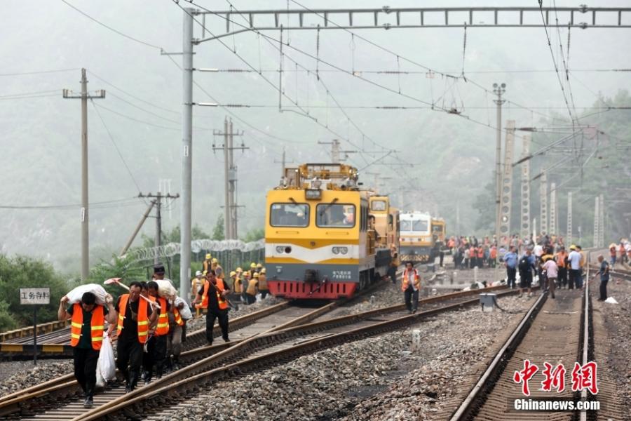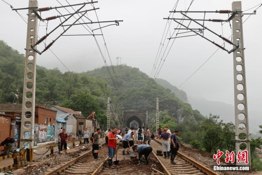 Rescue workers clear railway tracks on Fengtai-Shacheng railway in Mentougou district of Beijing, Aug. 1, 2023. (Photo: China News Service/Jia Tianyong)