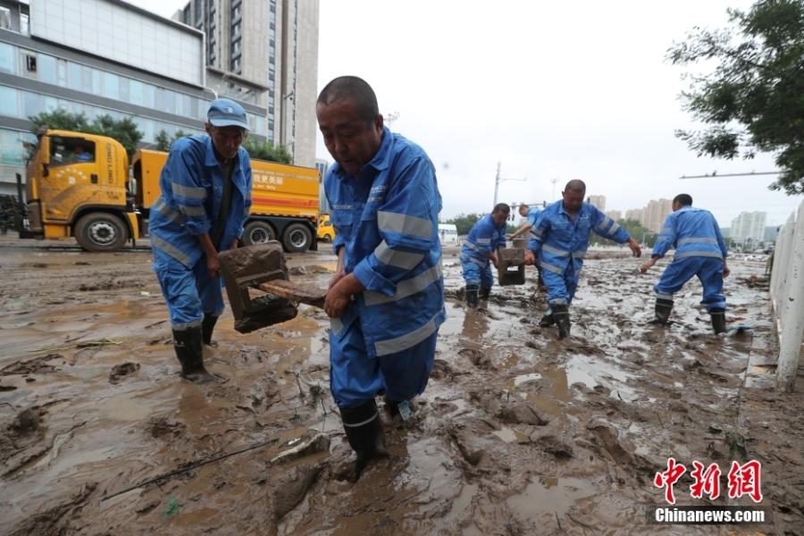 Sanitation workers clean up a street in Mentougou district of Beijing, Aug. 1, 2023. (Photo: China News Service/Jia Tianyong)