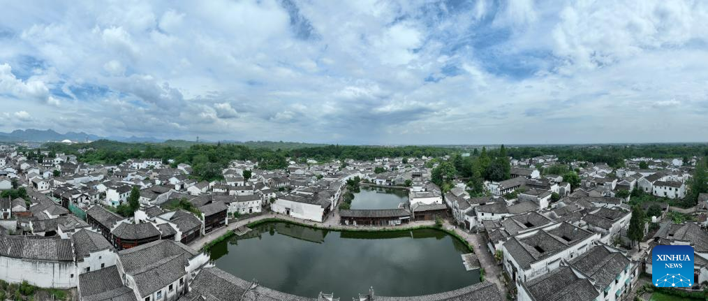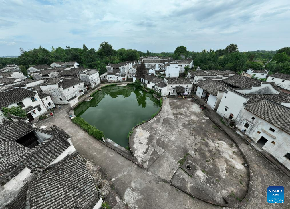 This aerial photo taken on Aug. 1, 2023 shows a pond in the shape of Eight Diagrams at the Zhuge Village of Lanxi City, east China's Zhejiang Province. The Zhuge Village, a historic gem with over 300 ancient buildings dating back to Ming and Qing dynasties (1368-1911), is home to descendents of Zhuge Liang, a renowned military strategist in the Three Kingdom Period (220-280). The village has made concerted efforts to preserve the ancient heritages and develop tourism, receiving over 500,000 visitors annually. (Xinhua/Weng Xinyang)