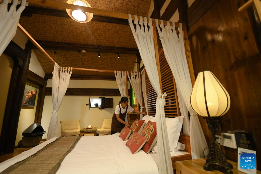 A staff member cleans up a room at a homestay in Zhuge Village of Lanxi City, east China's Zhejiang Province, Aug. 1, 2023. The Zhuge Village, a historic gem with over 300 ancient buildings dating back to Ming and Qing dynasties (1368-1911), is home to descendents of Zhuge Liang, a renowned military strategist in the Three Kingdom Period (220-280). The village has made concerted efforts to preserve the ancient heritages and develop tourism, receiving over 500,000 visitors annually. (Xinhua/Weng Xinyang)