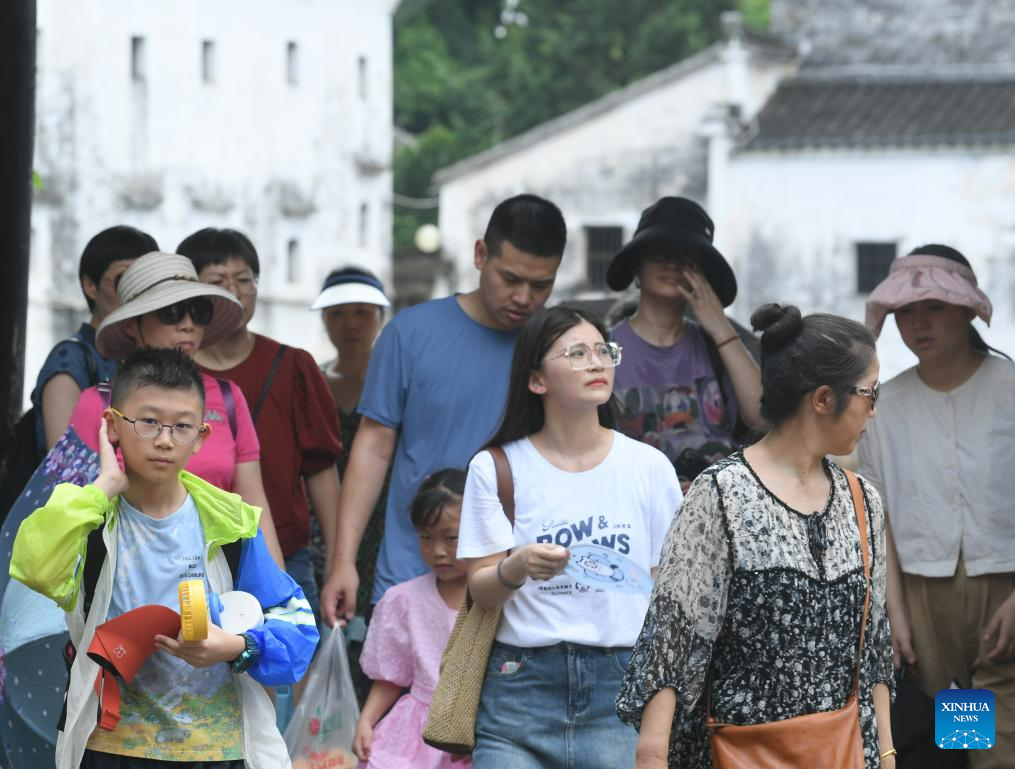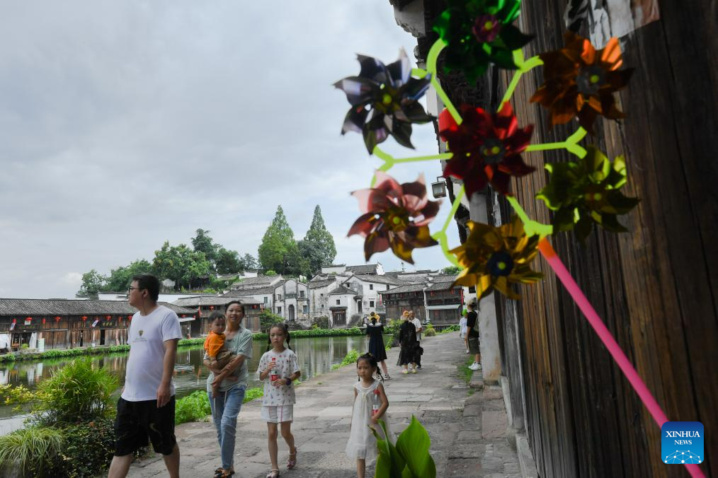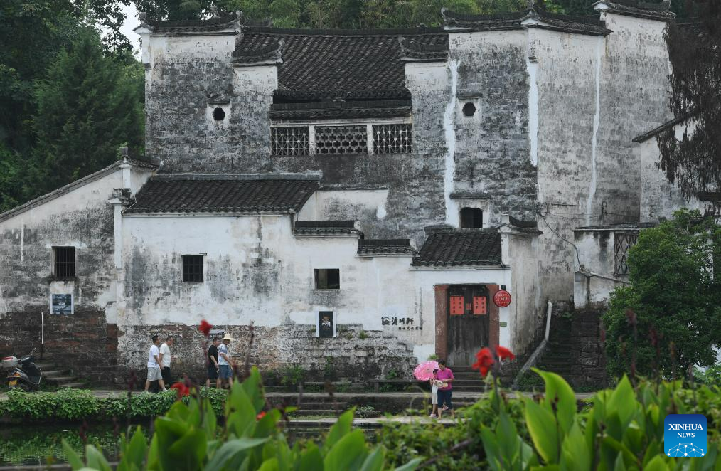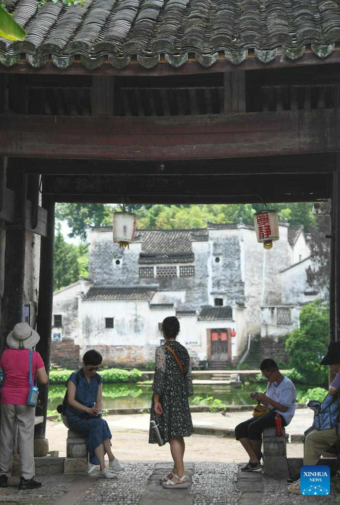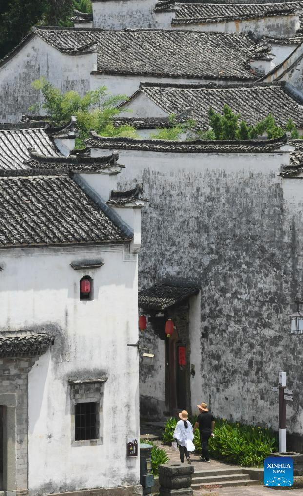 Tourists visit the Zhuge Village of Lanxi City, east China's Zhejiang Province, Aug. 1, 2023. The Zhuge Village, a historic gem with over 300 ancient buildings dating back to Ming and Qing dynasties (1368-1911), is home to descendents of Zhuge Liang, a renowned military strategist in the Three Kingdom Period (220-280). The village has made concerted efforts to preserve the ancient heritages and develop tourism, receiving over 500,000 visitors annually. (Xinhua/Weng Xinyang)