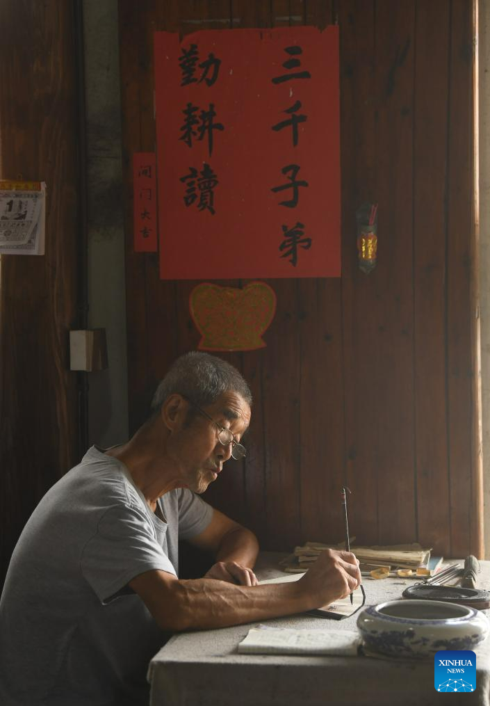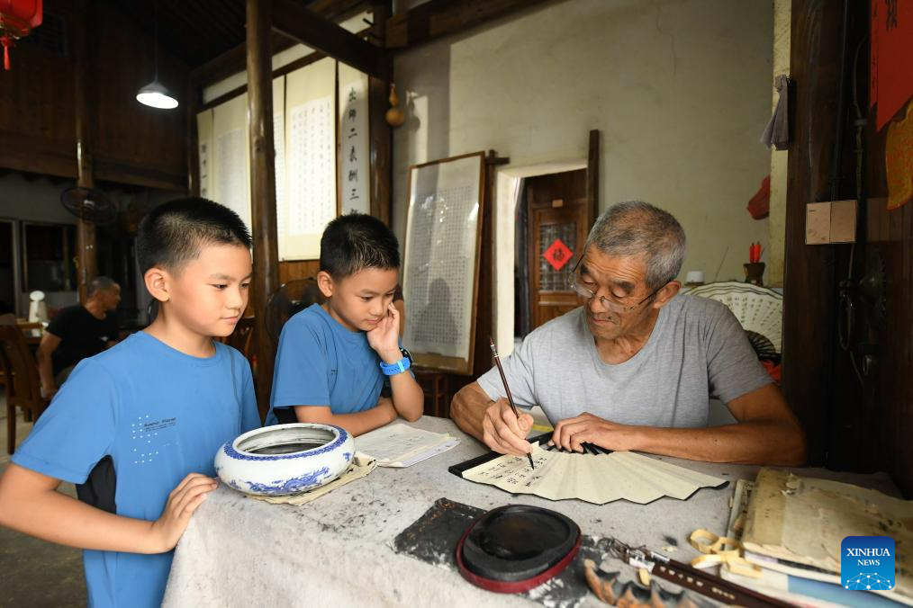 A villager writes on a fan covering in Zhuge Village of Lanxi City, east China's Zhejiang Province, Aug. 1, 2023. The Zhuge Village, a historic gem with over 300 ancient buildings dating back to Ming and Qing dynasties (1368-1911), is home to descendents of Zhuge Liang, a renowned military strategist in the Three Kingdom Period (220-280). The village has made concerted efforts to preserve the ancient heritages and develop tourism, receiving over 500,000 visitors annually. (Xinhua/Weng Xinyang)