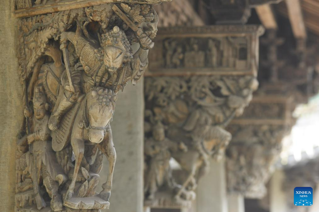 This photo taken on Aug. 1, 2023 shows decorative sculptures at an ancestral hall in Zhuge Village of Lanxi City, east China's Zhejiang Province. The Zhuge Village, a historic gem with over 300 ancient buildings dating back to Ming and Qing dynasties (1368-1911), is home to descendents of Zhuge Liang, a renowned military strategist in the Three Kingdom Period (220-280). The village has made concerted efforts to preserve the ancient heritages and develop tourism, receiving over 500,000 visitors annually. (Xinhua/Weng Xinyang)