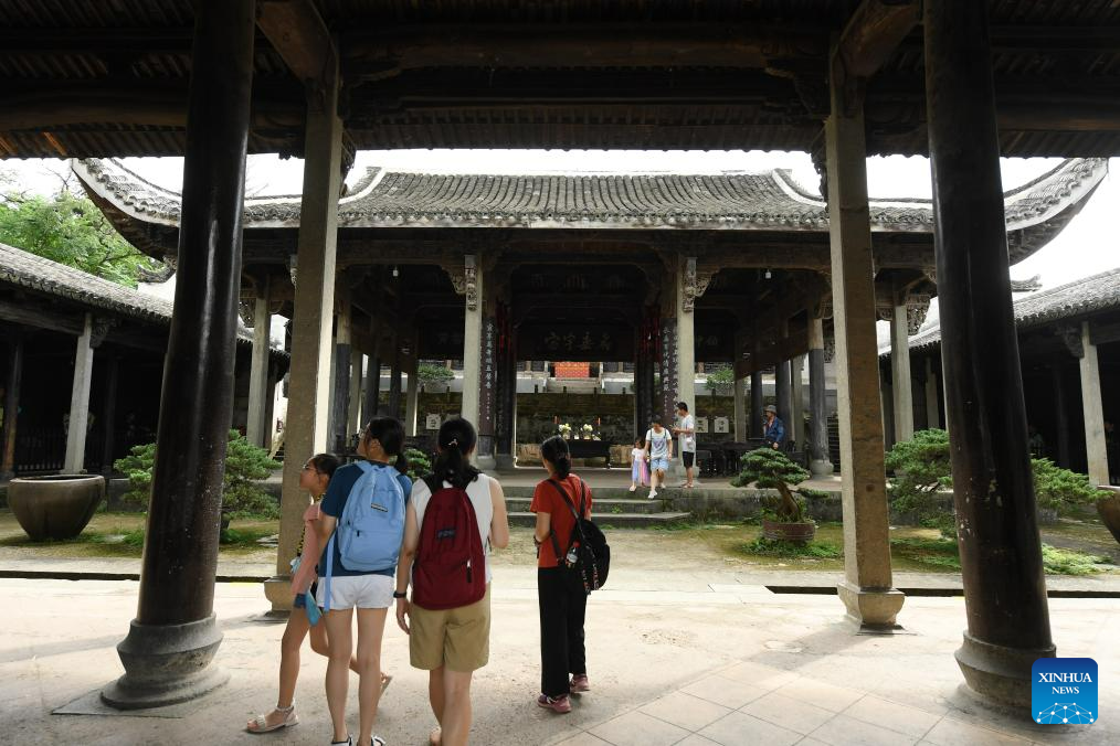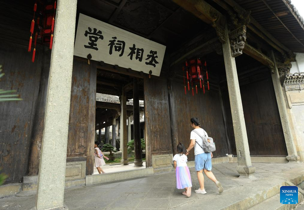 Tourists visit an ancestral hall at the Zhuge Village of Lanxi City, east China's Zhejiang Province, Aug. 1, 2023. The Zhuge Village, a historic gem with over 300 ancient buildings dating back to Ming and Qing dynasties (1368-1911), is home to descendents of Zhuge Liang, a renowned military strategist in the Three Kingdom Period (220-280). The village has made concerted efforts to preserve the ancient heritages and develop tourism, receiving over 500,000 visitors annually. (Xinhua/Weng Xinyang)