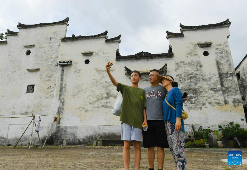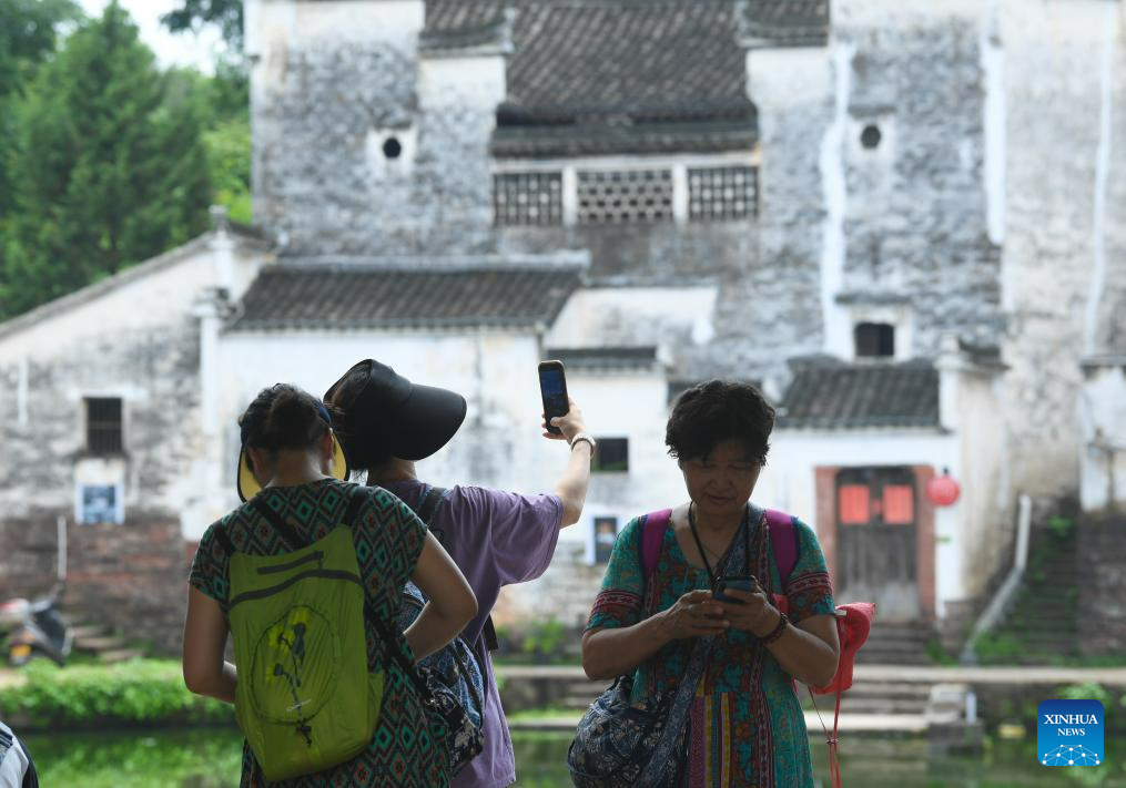 Tourists take a selfie at Zhuge Village of Lanxi City, east China's Zhejiang Province, Aug. 1, 2023. The Zhuge Village, a historic gem with over 300 ancient buildings dating back to Ming and Qing dynasties (1368-1911), is home to descendents of Zhuge Liang, a renowned military strategist in the Three Kingdom Period (220-280). The village has made concerted efforts to preserve the ancient heritages and develop tourism, receiving over 500,000 visitors annually. (Xinhua/Weng Xinyang)