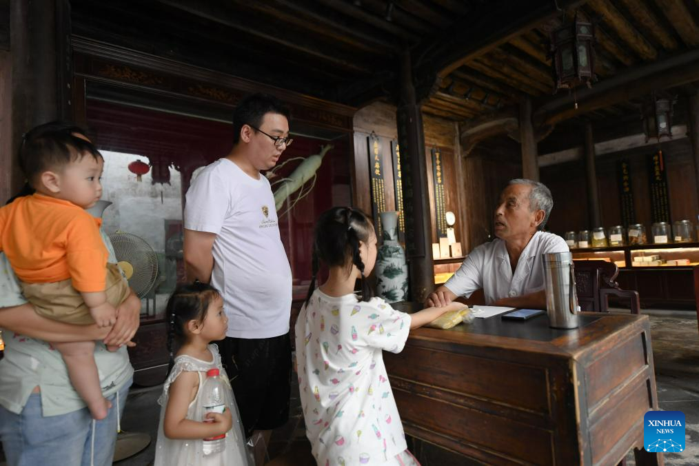 Tourists visit a traditional Chinese medicine clinic in Zhuge Village of Lanxi City, east China's Zhejiang Province, Aug. 1, 2023. The Zhuge Village, a historic gem with over 300 ancient buildings dating back to Ming and Qing dynasties (1368-1911), is home to descendents of Zhuge Liang, a renowned military strategist in the Three Kingdom Period (220-280). The village has made concerted efforts to preserve the ancient heritages and develop tourism, receiving over 500,000 visitors annually. (Xinhua/Weng Xinyang)