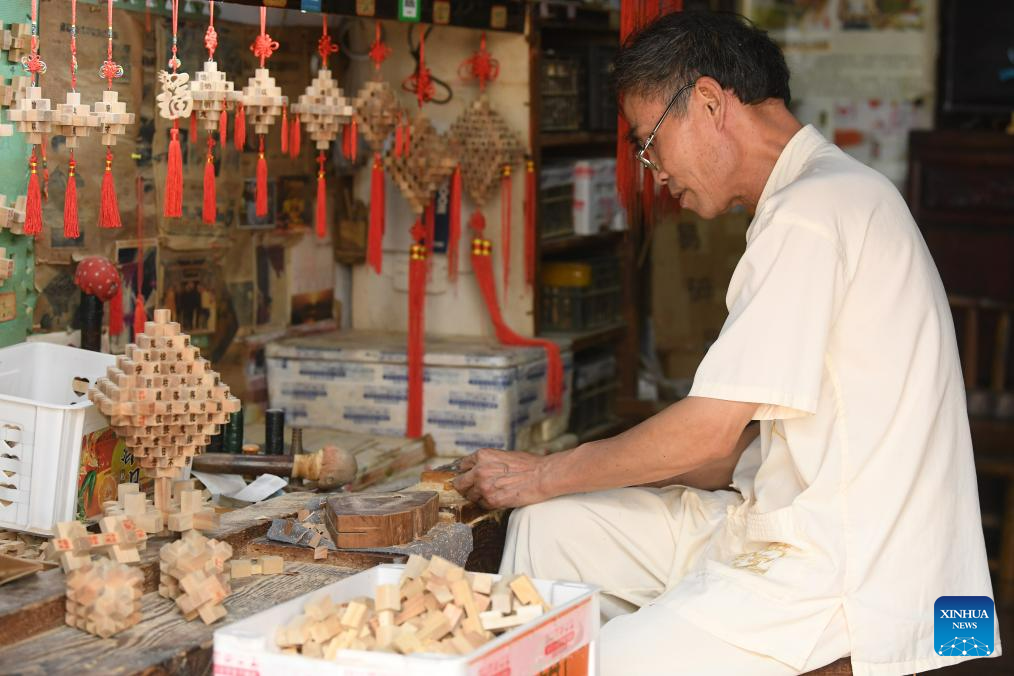 An intangible cultural heritage inheritor makes Kong Ming Lock, a traditional educational toy, in Zhuge Village of Lanxi City, east China's Zhejiang Province, Aug. 1, 2023. The Zhuge Village, a historic gem with over 300 ancient buildings dating back to Ming and Qing dynasties (1368-1911), is home to descendents of Zhuge Liang, a renowned military strategist in the Three Kingdom Period (220-280). The village has made concerted efforts to preserve the ancient heritages and develop tourism, receiving over 500,000 visitors annually. (Xinhua/Weng Xinyang)