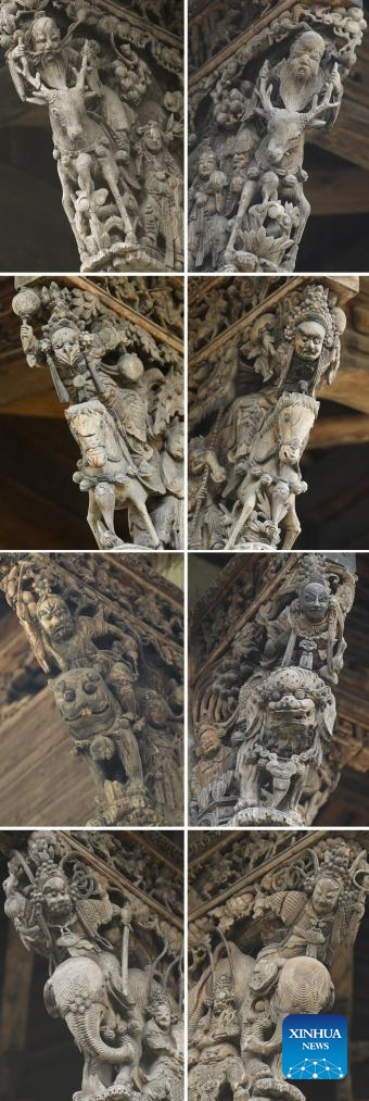 This combo photo taken on Aug. 1, 2023 shows decorative sculptures at an ancestral hall in Zhuge Village of Lanxi City, east China's Zhejiang Province. The Zhuge Village, a historic gem with over 300 ancient buildings dating back to Ming and Qing dynasties (1368-1911), is home to descendents of Zhuge Liang, a renowned military strategist in the Three Kingdom Period (220-280). The village has made concerted efforts to preserve the ancient heritages and develop tourism, receiving over 500,000 visitors annually. (Xinhua/Weng Xinyang)