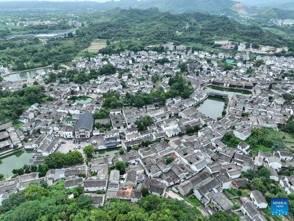 This aerial photo taken on Aug. 1, 2023 shows the Zhuge Village of Lanxi City, east China's Zhejiang Province. The Zhuge Village, a historic gem with over 300 ancient buildings dating back to Ming and Qing dynasties (1368-1911), is home to descendents of Zhuge Liang, a renowned military strategist in the Three Kingdom Period (220-280). The village has made concerted efforts to preserve the ancient heritages and develop tourism, receiving over 500,000 visitors annually. (Xinhua/Weng Xinyang)