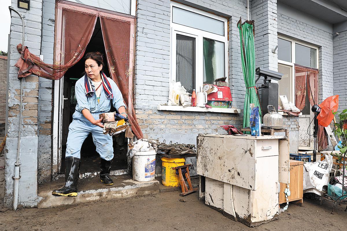 A resident in Beijing's Fangshan district, which experienced severe flooding, sorts out her belongings on Wednesday after water receded from her house. Feng Yongbin / CHINA DAILY