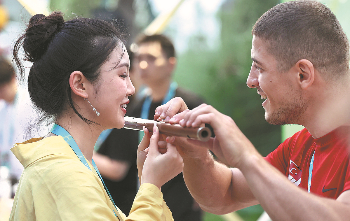A Turkish athlete is shown how to play the flute at the FISU Games Village in Chengdu, Sichuan province, on Monday. WEI XIAOHAO/CHINA DAILY