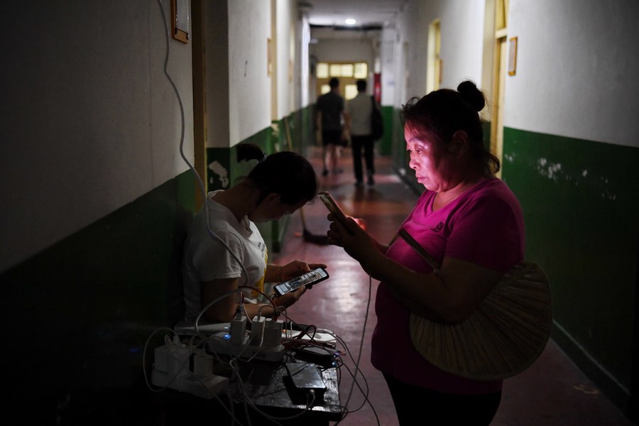 Evacuated residents charge their mobile phones at a temporary shelter in Zhuozhou, north China's Hebei Province, Aug. 1, 2023. (Xinhua/Mu Yu)