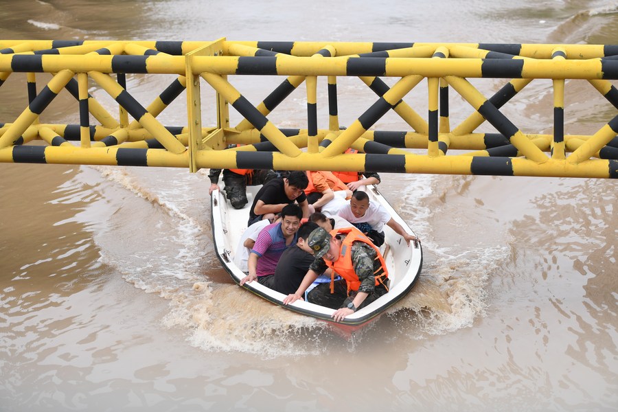 Rescuers transfer flood-trapped people in Zhuozhou, north China's Hebei Province, Aug. 2, 2023. (Xinhua/Mu Yu)