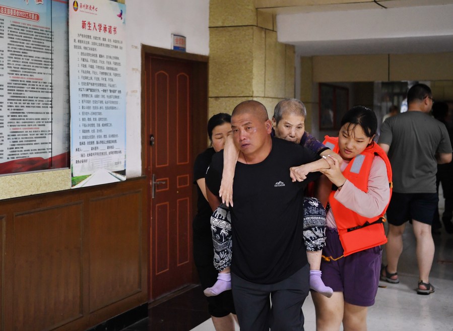 Evacuated residents enter a temporary shelter in Zhuozhou, north China's Hebei Province, Aug. 1, 2023. (Xinhua/Mu Yu)