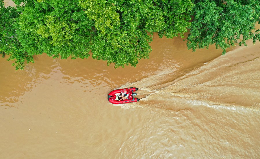 This aerial photo taken on Aug. 2, 2023 shows rescuers heading to transfer flood-trapped people in Zhuozhou, north China's Hebei Province. (Xinhua/Mu Yu)