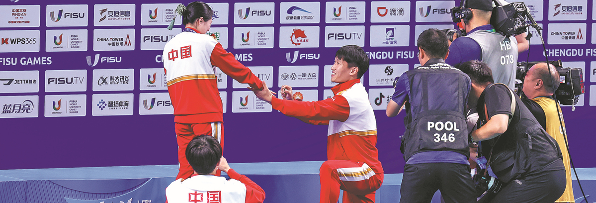 Hu Mingda (right) gets down on one knee to propose to his girlfriend and taekwondo teammate Liang Jie following the medal ceremony for the mixed pair poomsae competition at the Chengdu FISU World University Games on Sunday. DENG WEI/FOR CHINA DAILY