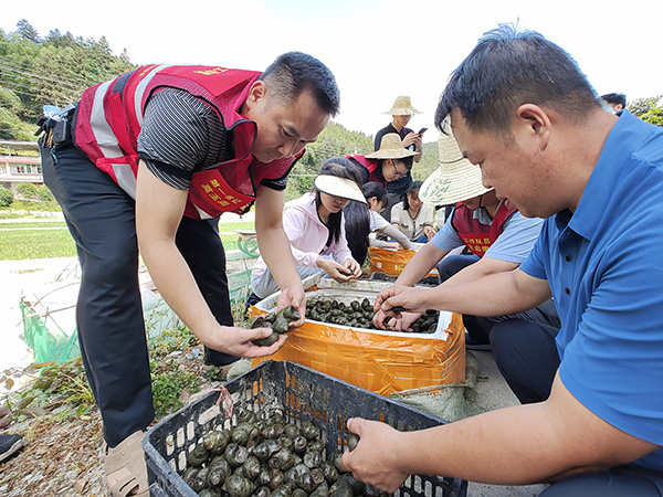 "Last year, our village built a rice-river snail co-culture demonstration base covering 20 mu. We achieved a bumper harvest of river snails, which didn't affect rice yield. This boosted our confidence. This year, the base was expanded to 50 mu, and its output value is expected to exceed 200,000 yuan," said Gong Congling, Party secretary of Maping village.