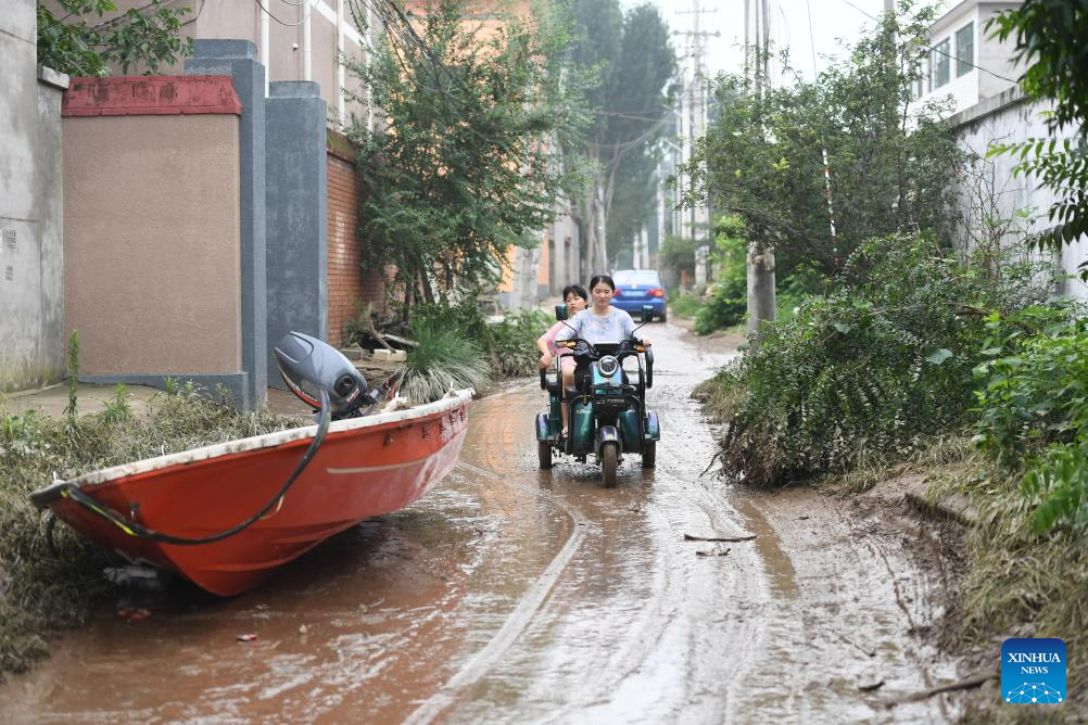Rescuers return after delivering life supplies to flood-hit residents in Shawo Village, Matou Town of Zhuozhou, north China's Hebei Province, Aug. 3, 2023. (Xinhua/Mu Yu)