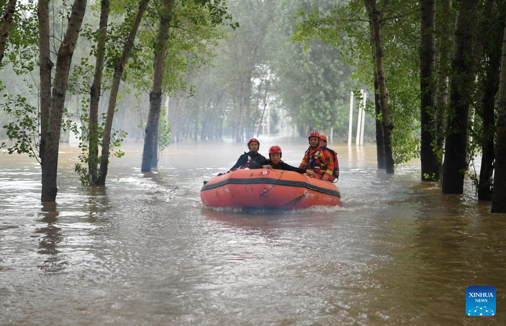 Rescuers carry out rescue operation in Shawo Village, Matou Town of Zhuozhou, north China's Hebei Province, Aug. 3, 2023. (Xinhua/Mu Yu)