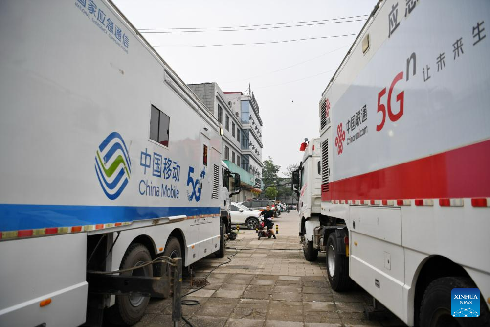 This photo taken on Aug. 3, 2023 shows emergency communication vehicles parking at a settlement site inside a middle school in Zhuozhou, north China's Hebei Province. (Xinhua/Mu Yu)