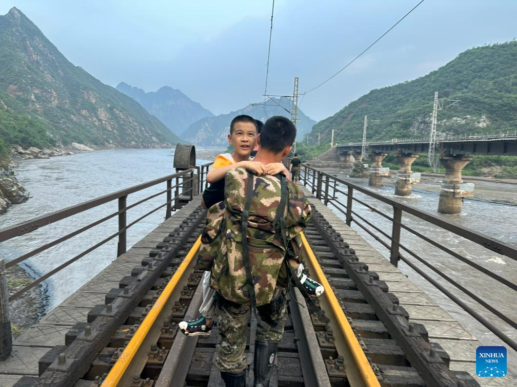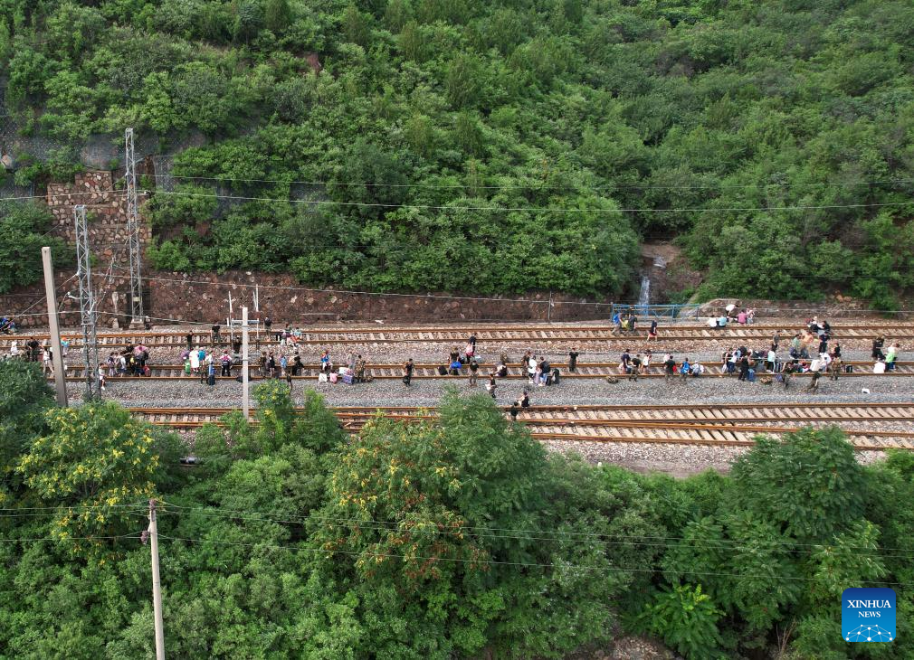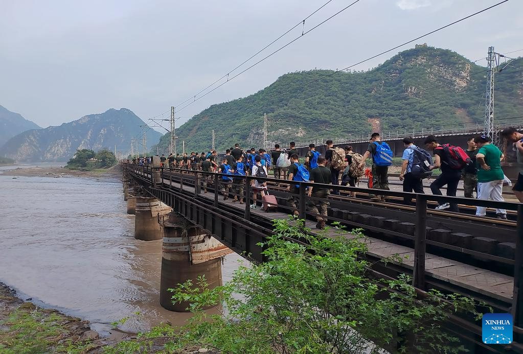 This photo taken by cellphone on Aug. 2, 2023 shows stranded passengers of Z180 heading to the transshipment train with the help of armed police in Mentougou District of Beijing, capital of China. (Xinhua/Wang Yangang)