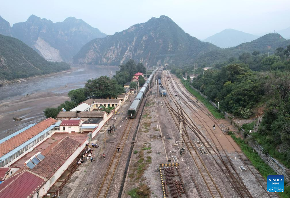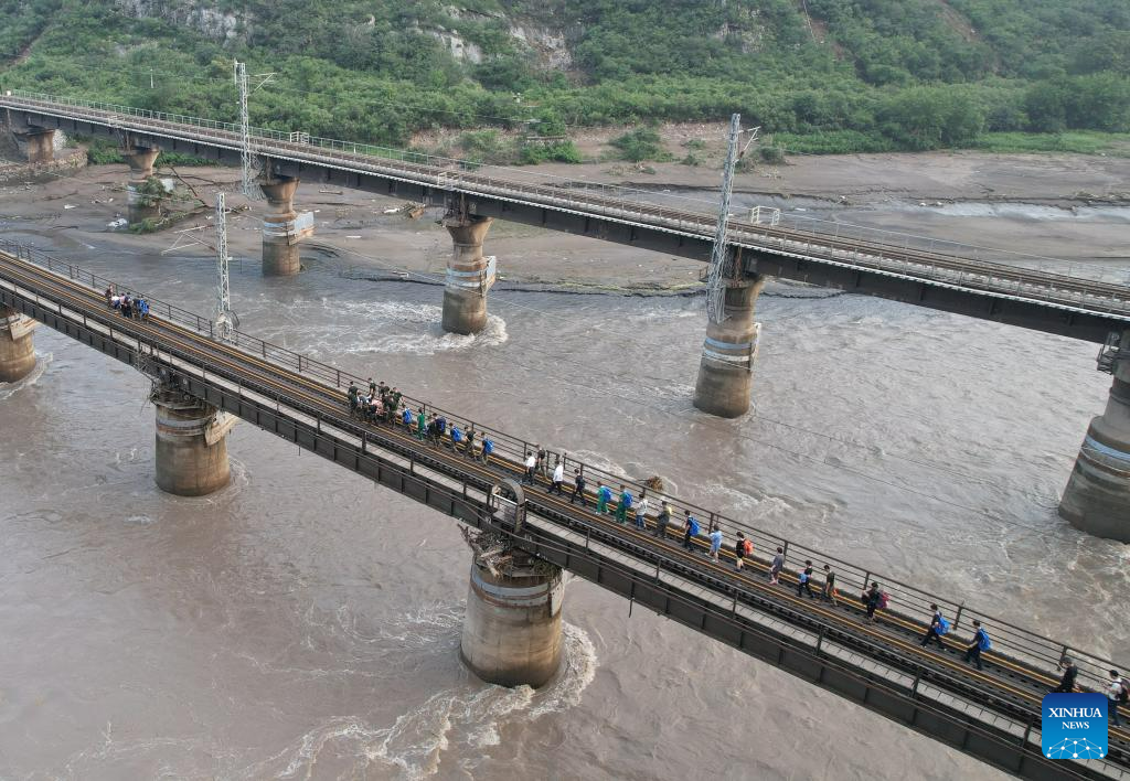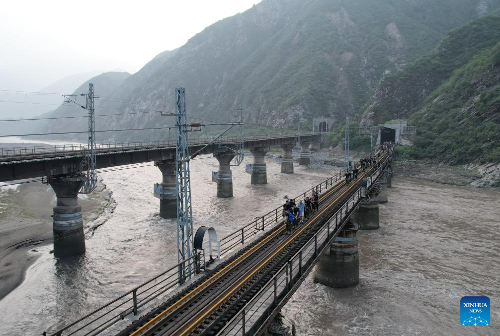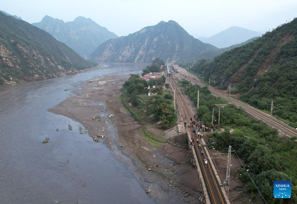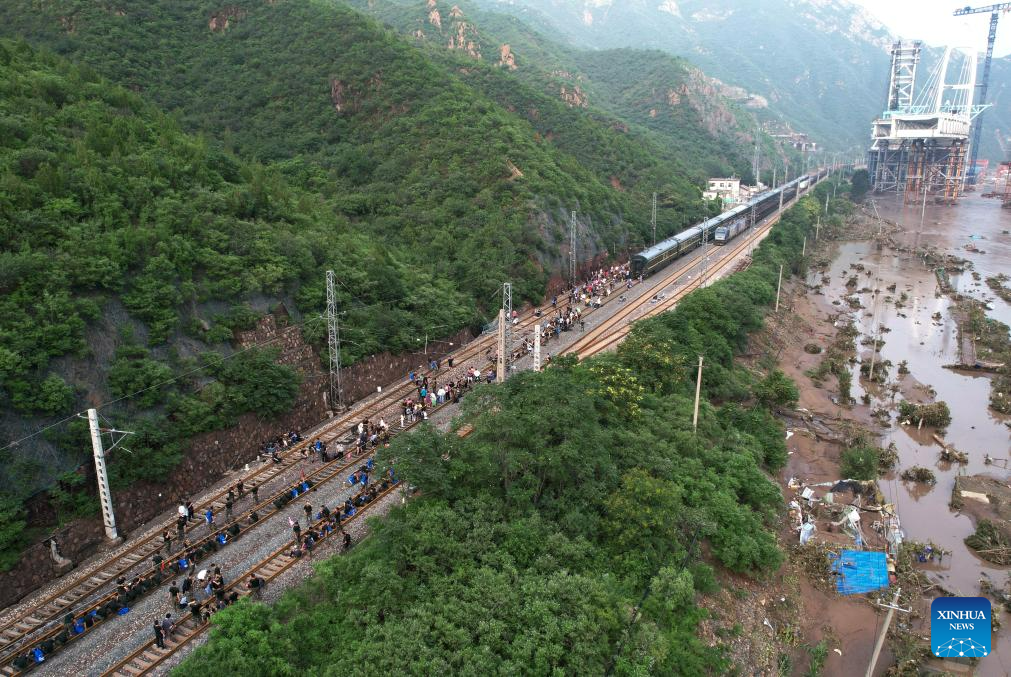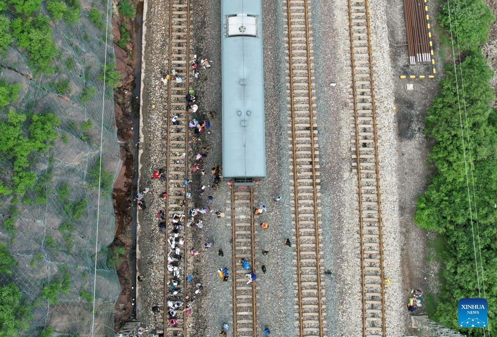 This aerial photo taken on Aug. 2, 2023 shows stranded passengers walking to the transshipment train with the help of rescuers in Mentougou District of Beijing, capital of China. (Xinhua/Zhang Chenlin)