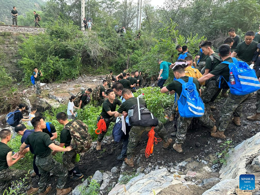 Armed police walk to transfer the stranded passengers in Mentougou District of Beijing, capital of China, Aug. 2, 2023. (Xinhua/Wang Yangang)