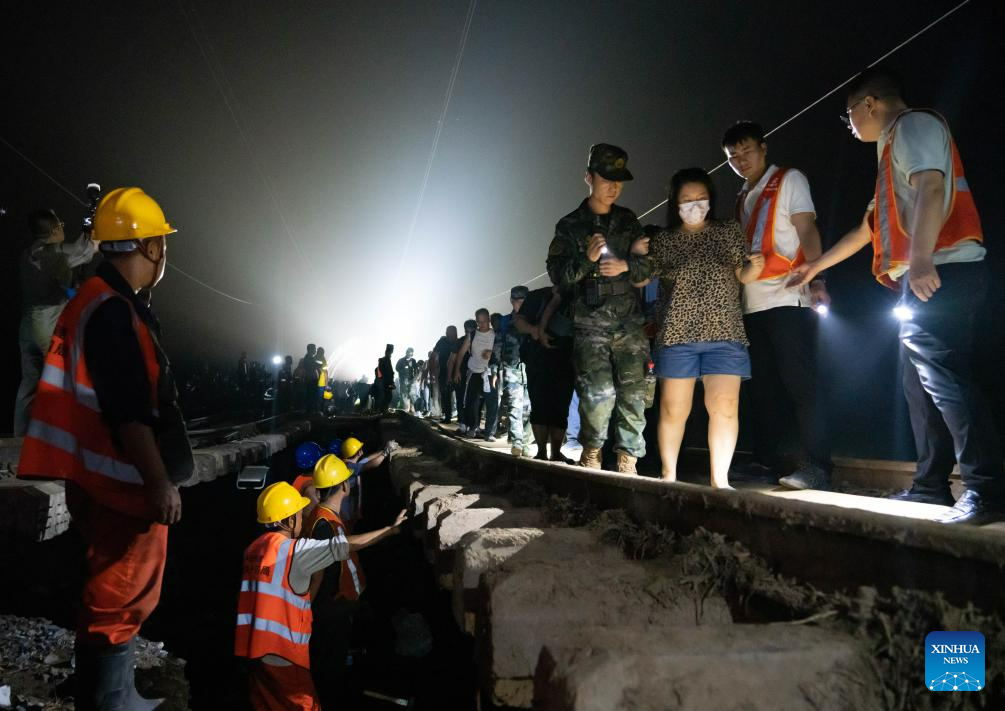 This photo taken by cellphone on Aug. 2, 2023 shows stranded passengers of Z180 walking to the transshipment train with the help of rescuers in Mentougou District of Beijing, capital of China. (Xinhua/Wang Yangang)
