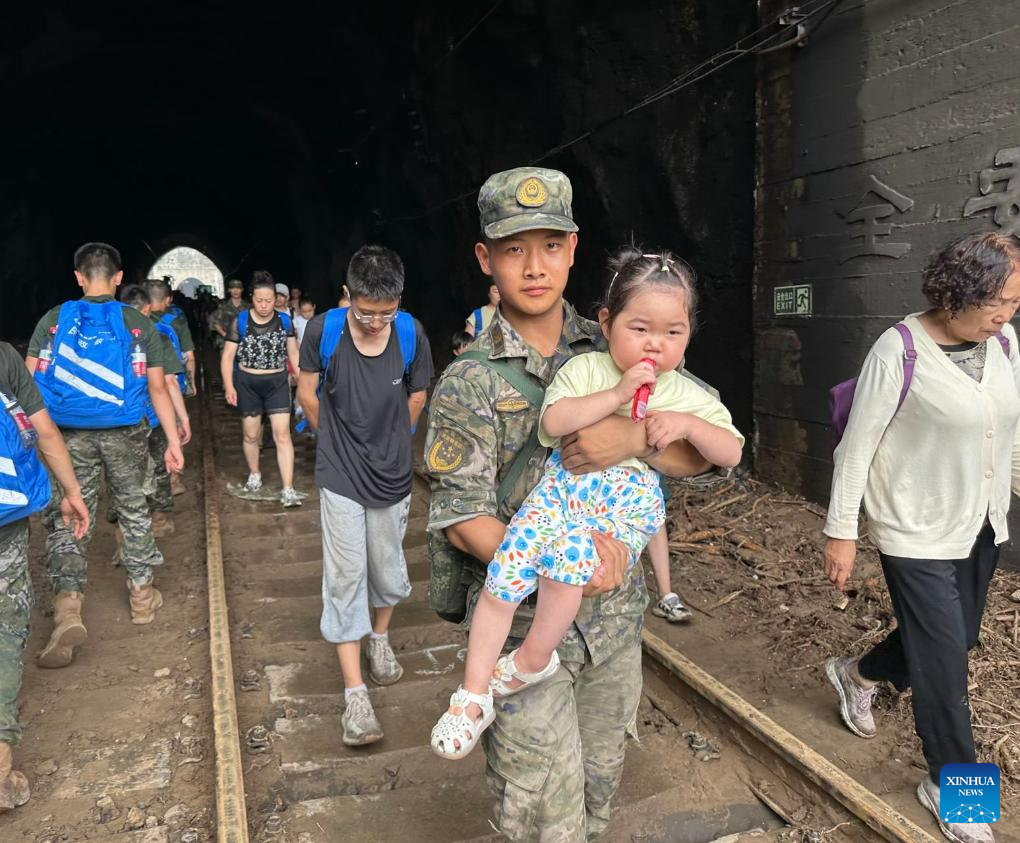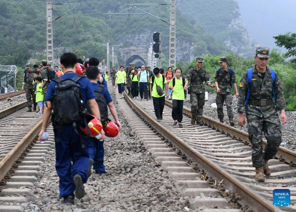 This photo taken by cellphone on Aug. 2, 2023 shows stranded passengers walking to the transshipment train with the help of armed police in Mentougou District of Beijing, capital of China. (Xinhua/Wang Yangang)