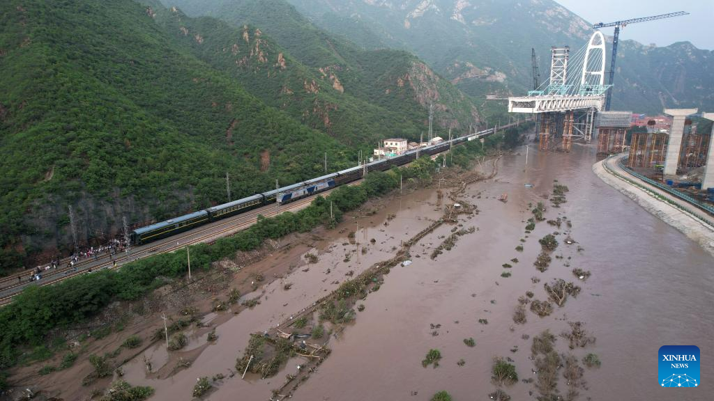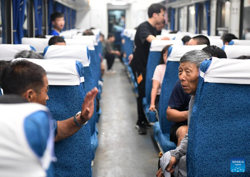 Stranded passengers of trains K396 and Z180 take a transshipment train to Fengtai Railway Station in Beijing, capital of China, Aug. 2, 2023. (Xinhua/Zhang Chenlin)