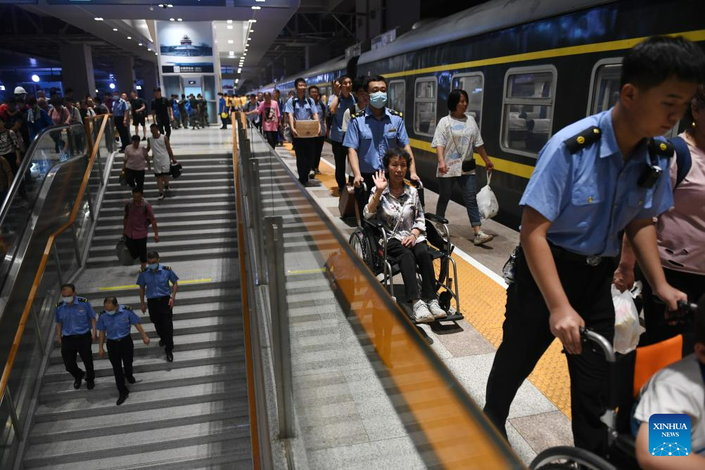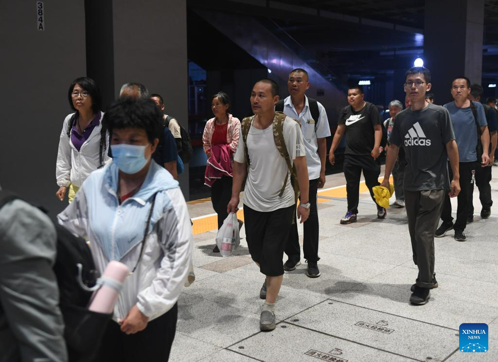 Stranded passengers of trains K396 and Z180 arrive at the Fengtai Railway Station in Beijing, capital of China, Aug. 3, 2023. (Xinhua/Zhang Chenlin)