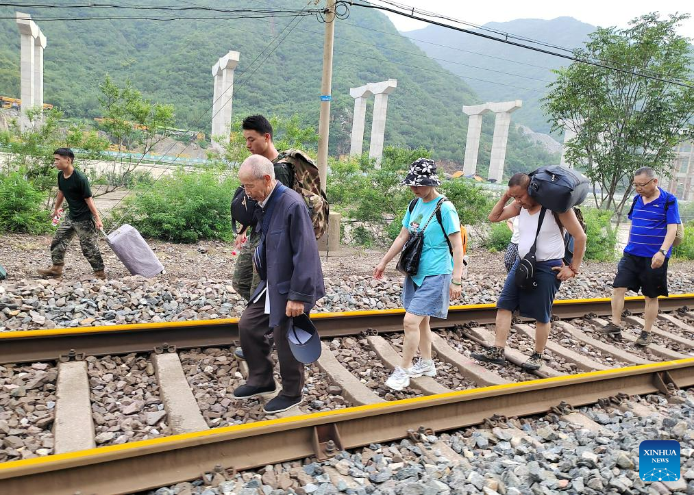 Stranded passengers of Z180 walk to the transshipment train in Mentougou District of Beijing, capital of China, Aug. 2, 2023. (Xinhua/Xie Han)?
