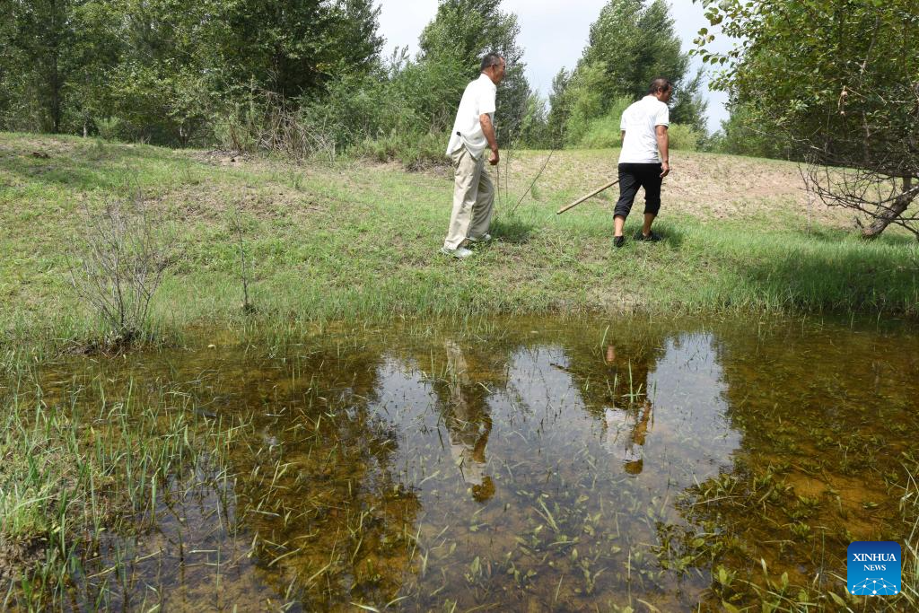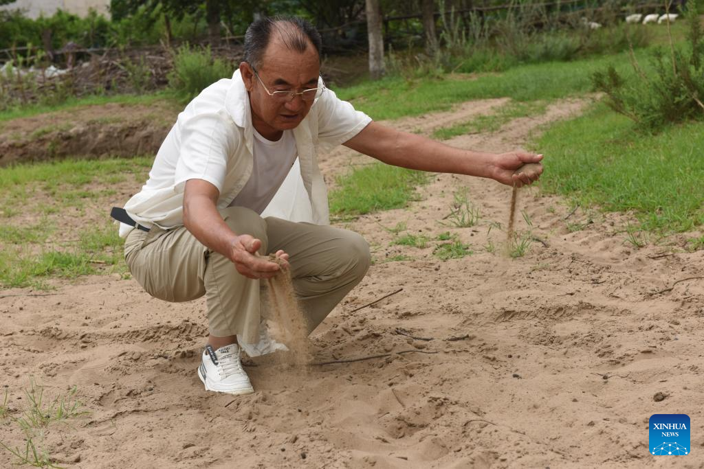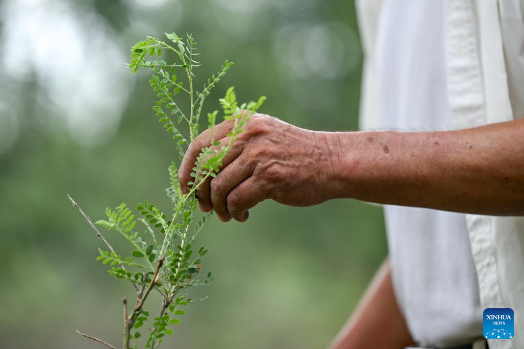 Bai Shun touches a Caragana plant in Bulteger Gacha, Horqin Left Wing Rear Banner of Tongliao City, north China's Inner Mongolia Autonomous Region, Aug. 2, 2023. (Xinhua/Lian Zhen)