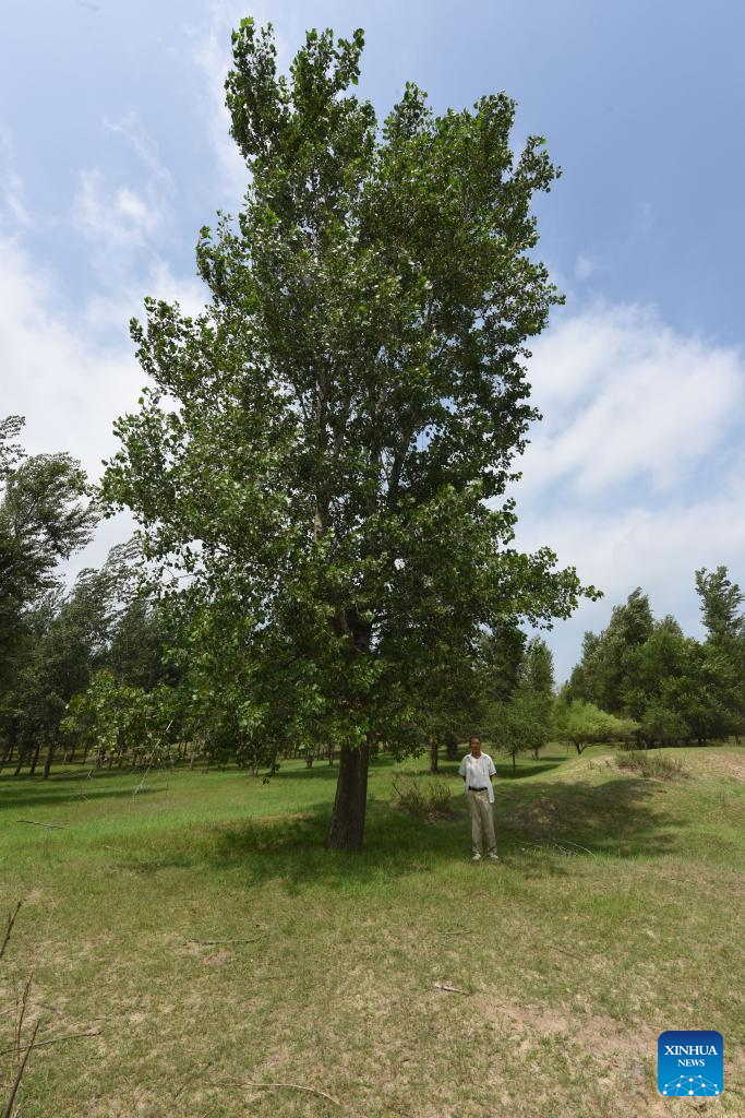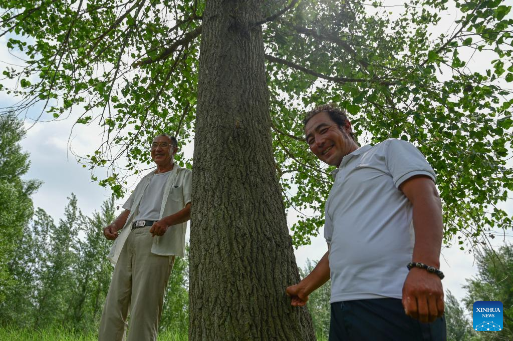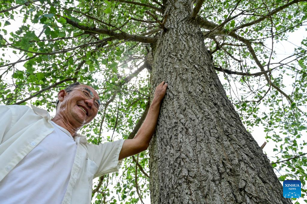 Bai Shun poses for photos with the first tree he planted in Bulteger Gacha, Horqin Left Wing Rear Banner of Tongliao City, north China's Inner Mongolia Autonomous Region, Aug. 2, 2023. (Xinhua/Huang Xiaoyong)