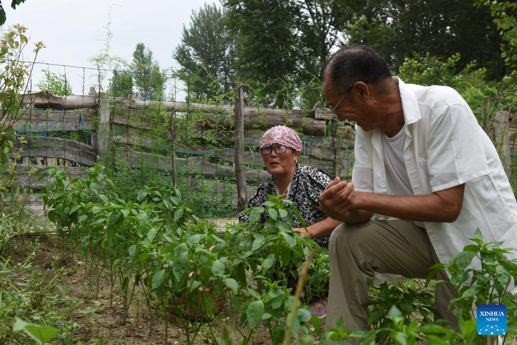 Bai Shun (R) and his wife work in the vegetable garden of their house in Bulteger Gacha, Horqin Left Wing Rear Banner of Tongliao City, north China's Inner Mongolia Autonomous Region, Aug. 2, 2023. (Xinhua/Huang Xiaoyong)