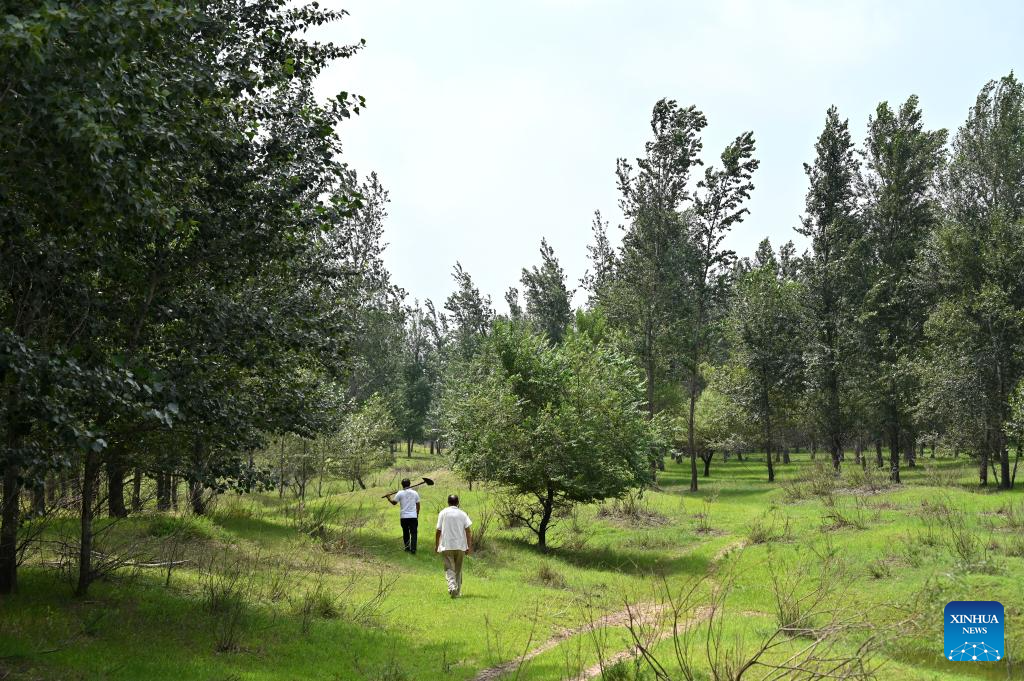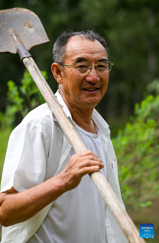 Bai Shun squats on a path in a forest, where used to be sandy, in Bulteger Gacha, Horqin Left Wing Rear Banner of Tongliao City, north China's Inner Mongolia Autonomous Region, Aug. 2, 2023. (Xinhua/Huang Xiaoyong)