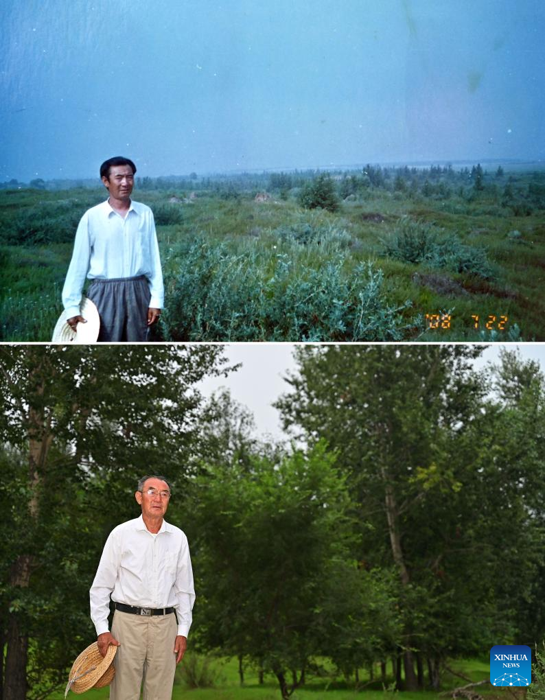 This combo photo shows Bai Shun posing for photos in Bulteger Gacha, Horqin Left Wing Rear Banner of Tongliao City, north China's Inner Mongolia Autonomous Region in 2008 (above, file photo) and him posing for photos in front of a forest in Bulteger Gacha, Horqin Left Wing Rear Banner of Tongliao City, north China's Inner Mongolia Autonomous Region, Aug. 2, 2023 (below, photo taken by Xinhua photographer Lian Zhen). (Xinhua)