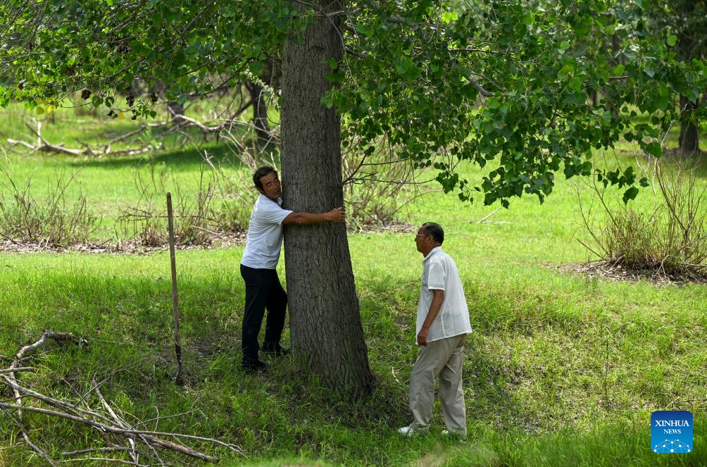 Bai Shun touches the first tree he planted in Bulteger Gacha, Horqin Left Wing Rear Banner of Tongliao City, north China's Inner Mongolia Autonomous Region, Aug. 2, 2023. (Xinhua/Lian Zhen)