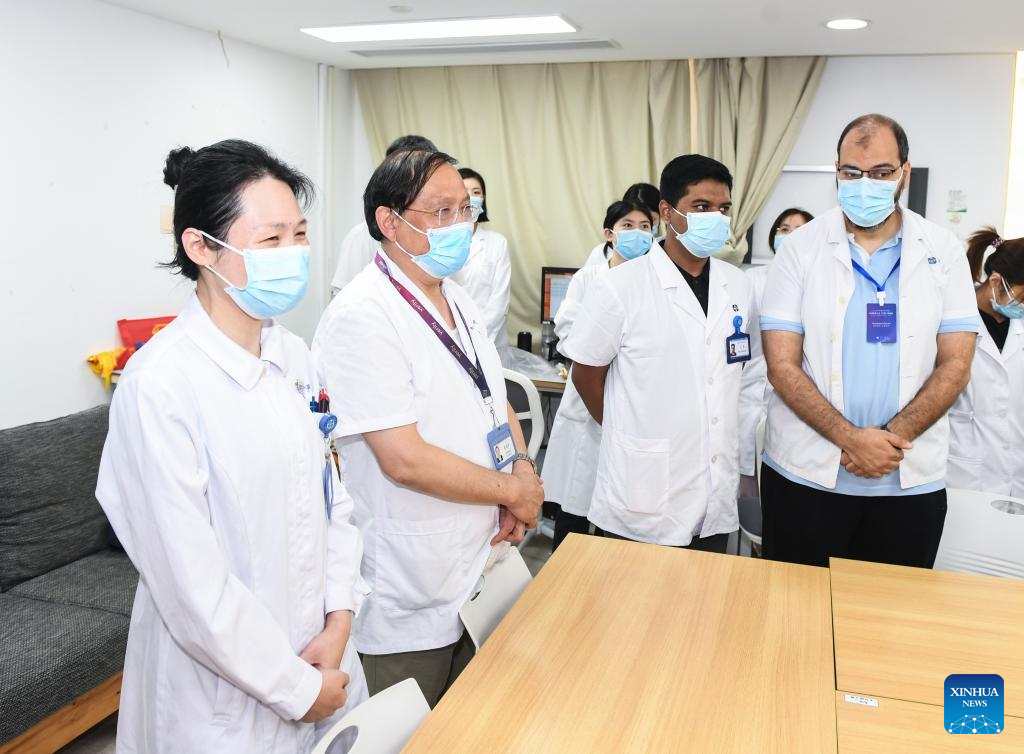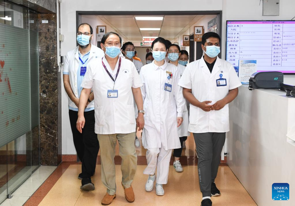 Fan Zhining (L front), expert of digestive endoscopy, visits the inpatient wards with foreign medical workers of a medical seminar at Jiangsu Province Hospital in Nanjing, capital of east China's Jiangsu Province, Aug. 1, 2023. In recent years, Jiangsu Province Hospital cooperated with medical institutions in Pakistan, Egypt and other countries and regions in the field of digestive endoscopy to promote medical cooperation under the Belt and Road Initiative. (Xinhua/Ji Chunpeng)