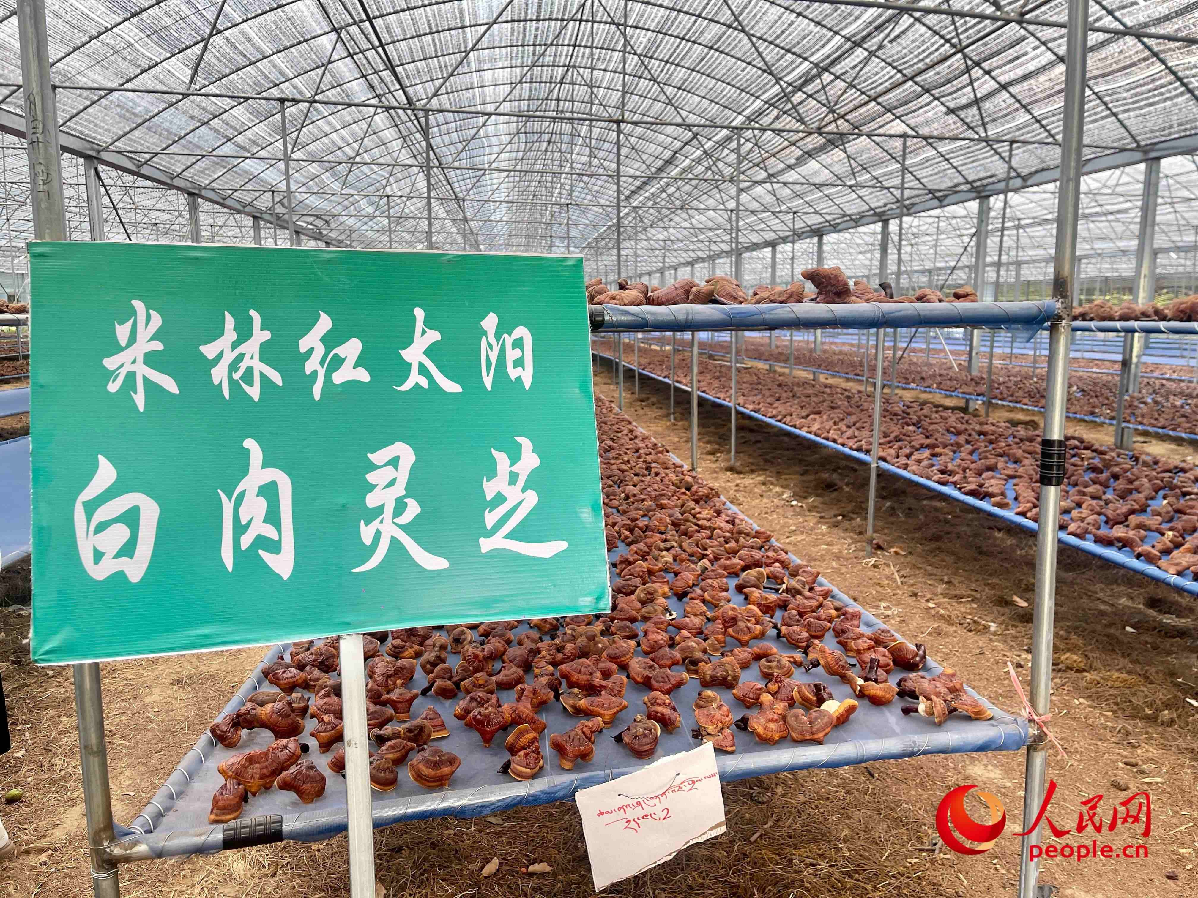 Photo shows Ganoderma leucocontextum, a new variety of fungus species endemic to the Qinghai-Tibet Plateau, in a farm greenhouse in Xueka village, Milin town, Milin county, Nyingchi, southwest China's Tibet Autonomous Region. (People's Daily Online/Zhou Jingyuan)