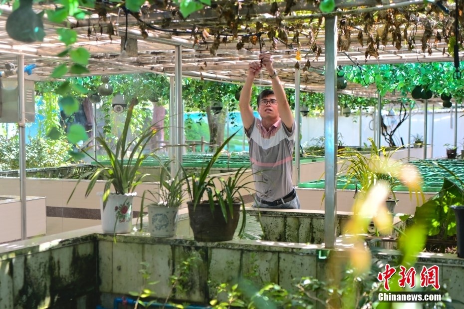 He Nan, a Chinese crocodile lizard conservator at the Luokeng nature reserve in south China's Guangdong Province, adjusts a water spray device used to cool the living environment of Chinese crocodile lizards in the nature reserve. (China News Service/Chen Jimin)