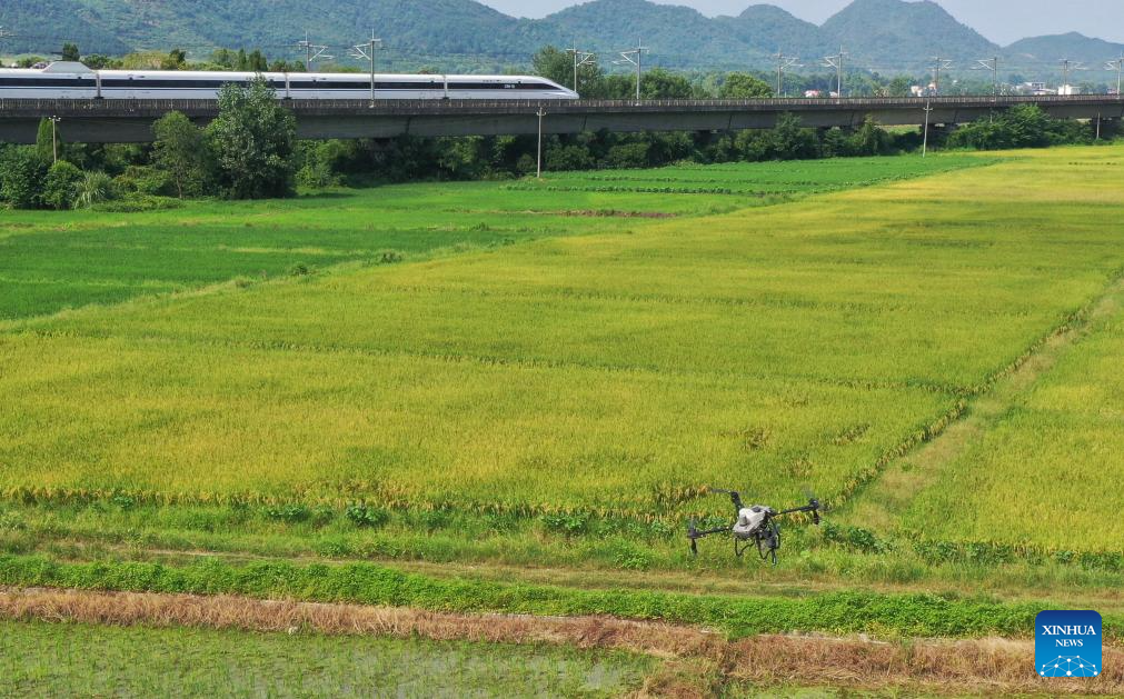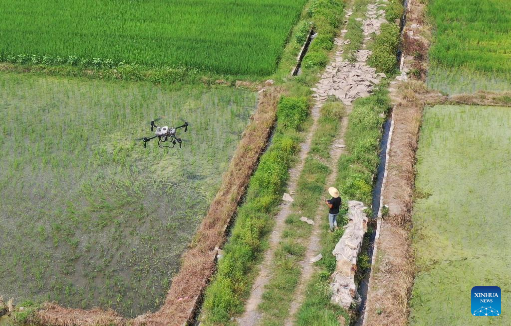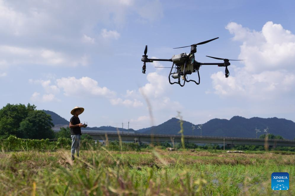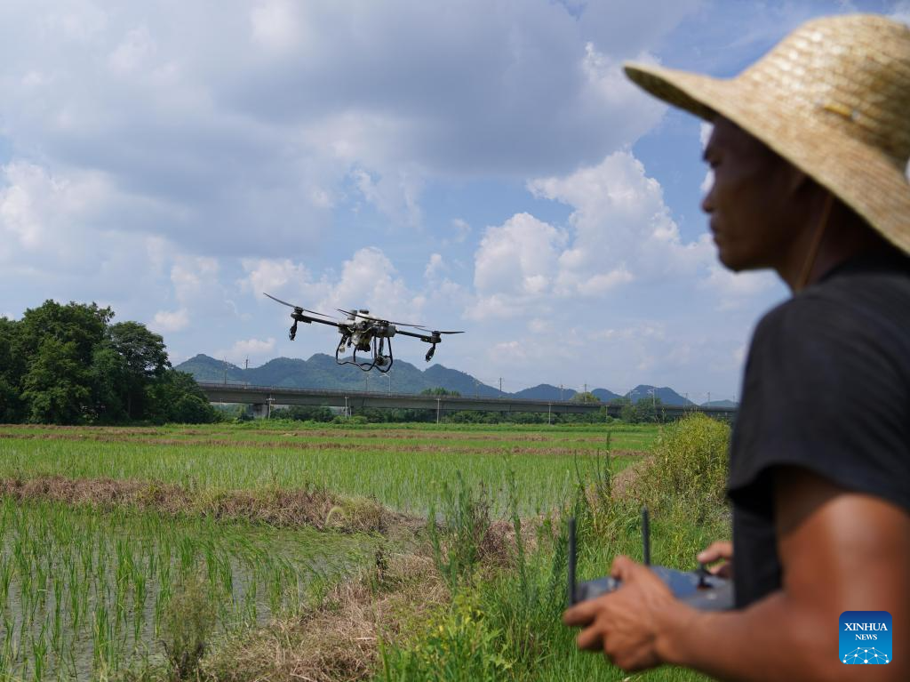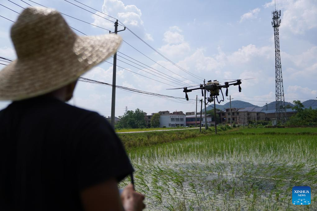 This photo taken on Aug. 3, 2023 shows a farmer operating a drone to spray fertilizer in the field in Fenyi County of Xinyu City, east China's Jiangxi Province. The application of agricultural machines such as rice transplanters and drones has boosted the agricultural efficiency in Fenyi County. The cultivation area for late rice here has reached 122,000 mu (about 8,133 hectares), achieving a mechanization rate of 83.44 percent. (Xinhua/Zhou Mi)