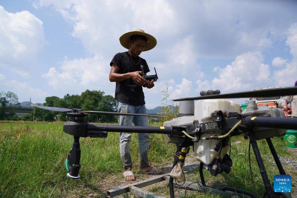 This photo taken on Aug. 3, 2023 shows a farmer preparing to operate a drone in the field in Fenyi County of Xinyu City, east China's Jiangxi Province. The application of agricultural machines such as rice transplanters and drones has boosted the agricultural efficiency in Fenyi County. The cultivation area for late rice here has reached 122,000 mu (about 8,133 hectares), achieving a mechanization rate of 83.44 percent. (Xinhua/Zhou Mi)